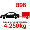 Pkw-Klassen » Anhängerkurs B96Die 2013 eingeführte „Zwischenklasse“ B96 ermöglicht es allen Inhabern der Fahrerlaubnisklasse B auch schwerere Anhänger zu fahren, ohne dabei den umständlichen Weg über eine theoretische oder praktische Prüfung gehen zu müssen. Der Kurs gestaltet sich wie unten beschrieben. Mit der Schlüsselzahl 96 ist man berechtigt, folgende Fahrzeugkombination zu fahren: |